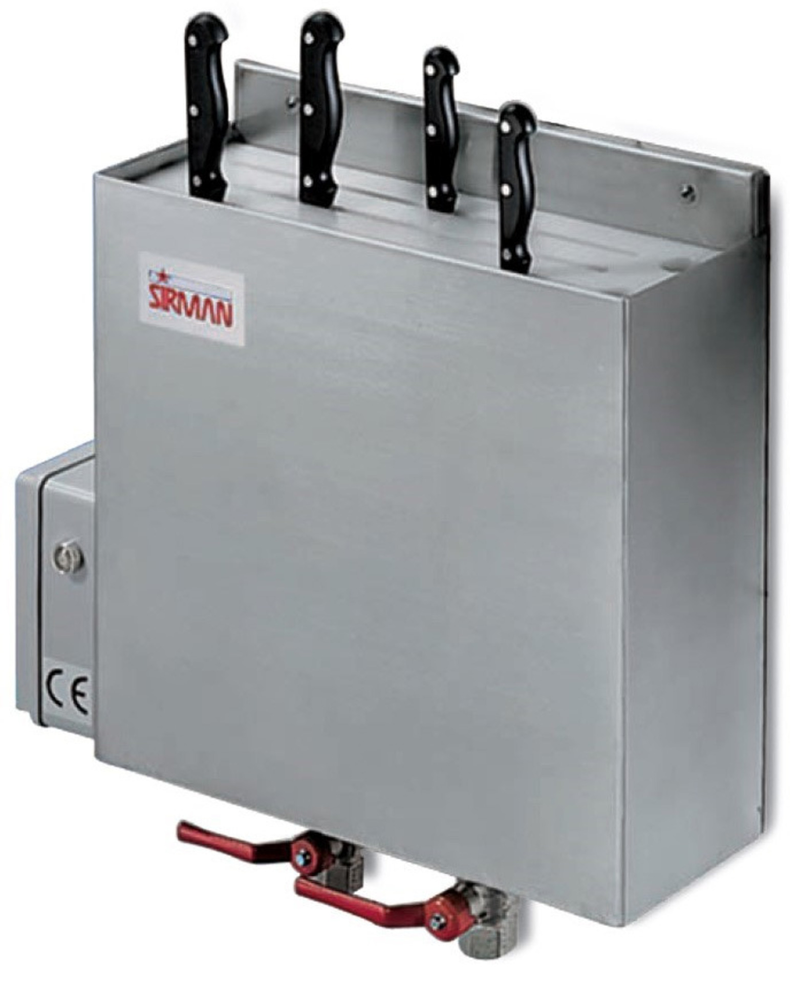 Ηλεκτρικός αποστειρωτής που απολυμαίνει με νερό σε θερμοκρασία 110°C. Κατασκευασμένος από ανοξείδωτο ατσάλι και κάλυμμα πολυαιθυλενίου HD. Είναι κατάλληλος για την αποθήκευση οποιουδήποτε είδους μαχαιριών που έχει απολυμανθεί μέσω υγρού σύμφωνα με τους κανονισμούς HACCP. Ο ηλεκτρικός αποστειρωτής λειτουργεί με δυο συνδέσεις εισόδου και εξόδου νερού που ρυθμίζονται από 2 στρόφιγγες για να αποφευχθεί τυχόν διαρροή. Αυτόματη ρύθμιση θερμοκρασίας στους 90°C.