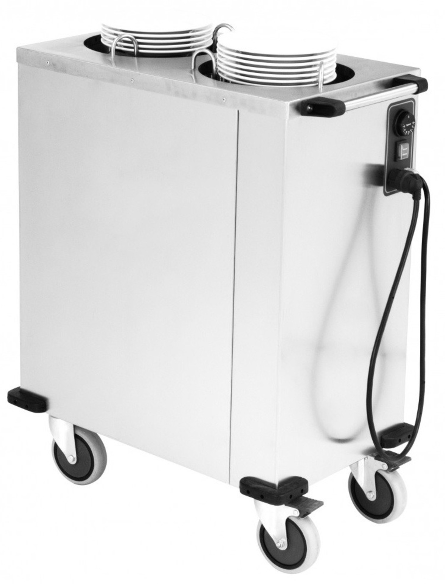 Ανοξείδωτο τροχήλατο dispenser πιάτων για μεταφορά, αποθήκευση πιάτων και για σερβίρισμα στο σωστό ύψος εργασίας. Χρήση σε κρύο ή ζεστό μπουφέ, σε συστήματα self service καθώς και γραμμές προετοιμασίας φαγητού. Τα πιάτα ανεβαίνουν στο ύψος με τη χρήση ελατηρίων.