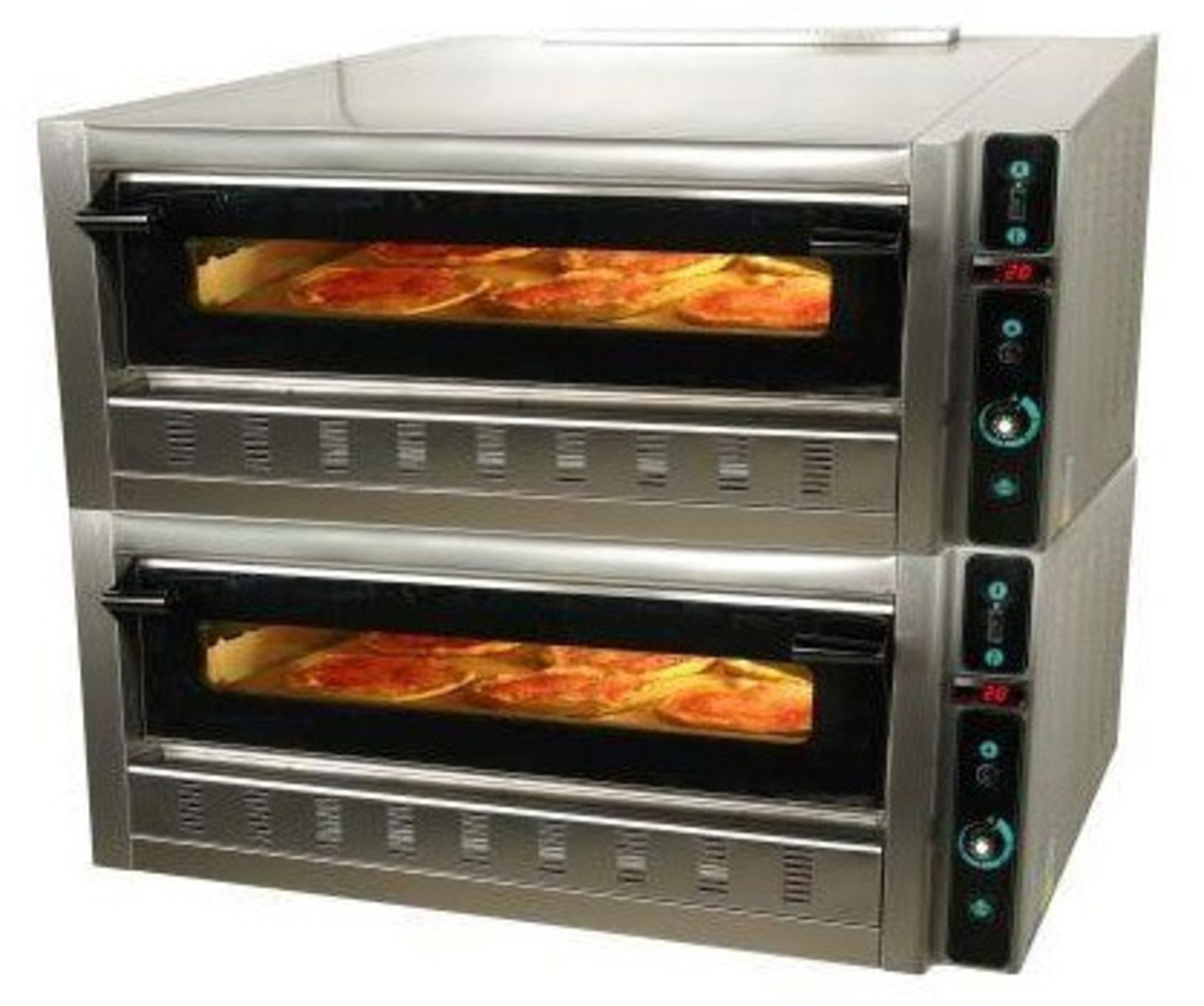 Mε ιδιαίτερη σχεδίαση τοιχωμάτων, παρέχουν την ικανότητα να ανεβάζουν μέγιστη θερμοκρασία σε πολύ μικρό χρονικό διάστημα και να τη διατηρούν σταθερή. Η επιφάνεια ψησίματος είναι από πυρίμαχη πλάκα έτσι ώστε να μπορείτε να ψήσετε απευθείας χωρίς ταψί. Η επιλογή της επιθυμητής θερμοκρασίας γίνεται με θερμοστάτη και επιτηρείτε από ψηφιακό θερμόμετρο. Η πόρτα είναι τύπου φούρνου αρτοποιίας με πρόσοψη από πυρίμαχο κρύσταλλο για εύκολη εισαγωγή και εξαγωγή των προϊόντων και άμεση επιτήρηση του εσωτερικού θαλάμου. Η χωρητικότητα είναι 9+9 πίτσες διαμέτρου 30 cm.