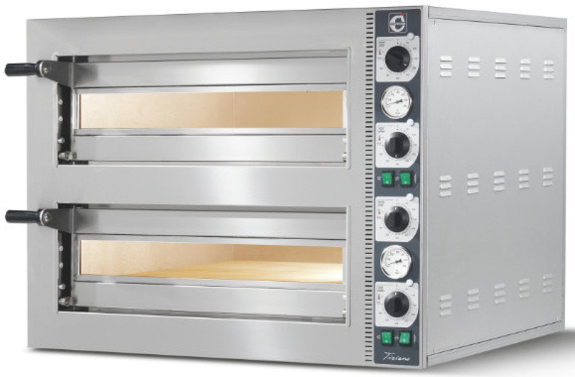 -Δύο όροφοι με ανεξάρτητα χειροκίνητα πάνελ -Ανεξάρτητοι διακόπτες ρύθμισης θερμοκρασίας για την επάνω και και για την κάτω επιφάνεια. -Εσωτερικός φωτισμός με διακόπτη on/off -Θερμοστάτης ασφαλείας -Πόρτα με τζάμι -Εσωτερικό θερμόμετρο ένδειξης θερμοκρασίας -Max θερμοκρασία 400 ºC