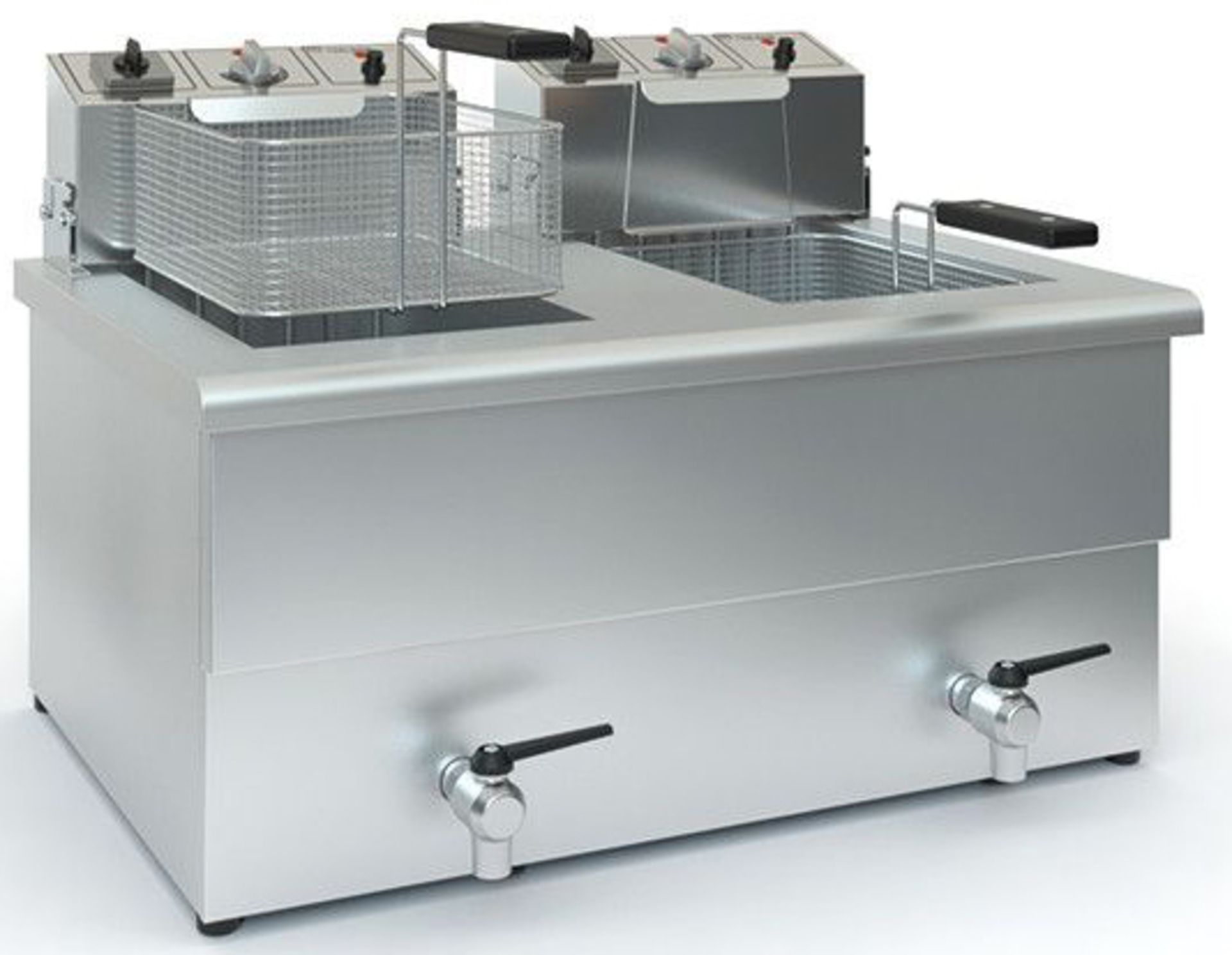 Φριτέζα 2 κάδων, 10-12 ΛΙΤΡΩΝ, με ΒΡΥΣΑΚΙ και ξεχωριστή ηλεκτρική σύνδεση ο καθένας (τριφασικοί κάδοι). Με δυνατότητα επιλογής 5100W ή 7500W ισχύ.