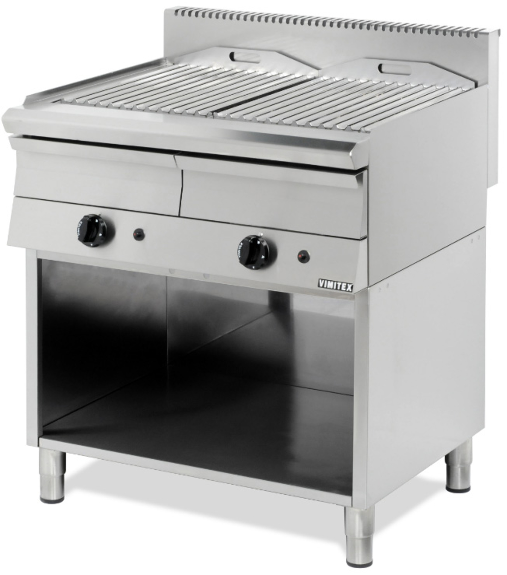 Επιδαπέδιο γκριλ αερίου με 2 ισχυρούς καυστήρες, ιδανικό για μεγάλες απαιτήσεις παραγωγής, σε ερμάριο βάσης (ανοιχτό η κλειστό κατ´ επιλογή) για επιπλέον αποθήκευση. Η ανάφλεξη και η επίβλεψη της φλόγας γίνεται με πιεζοηλεκτρικό αναπτήρα και πιλότο, τοποθετημένα σε απόλυτα προστατευμένο σημείο από λίπη και λάδια στο μπροστινό μέρος της συσκευής για εύκολη πρόσβαση. Αξιόπιστη και φιλική προς το χρήστη συσκευή, κατασκευασμένη από υλικά άριστης ποιότητας, προορίζεται για μεγάλες απαιτήσεις παραγωγής.