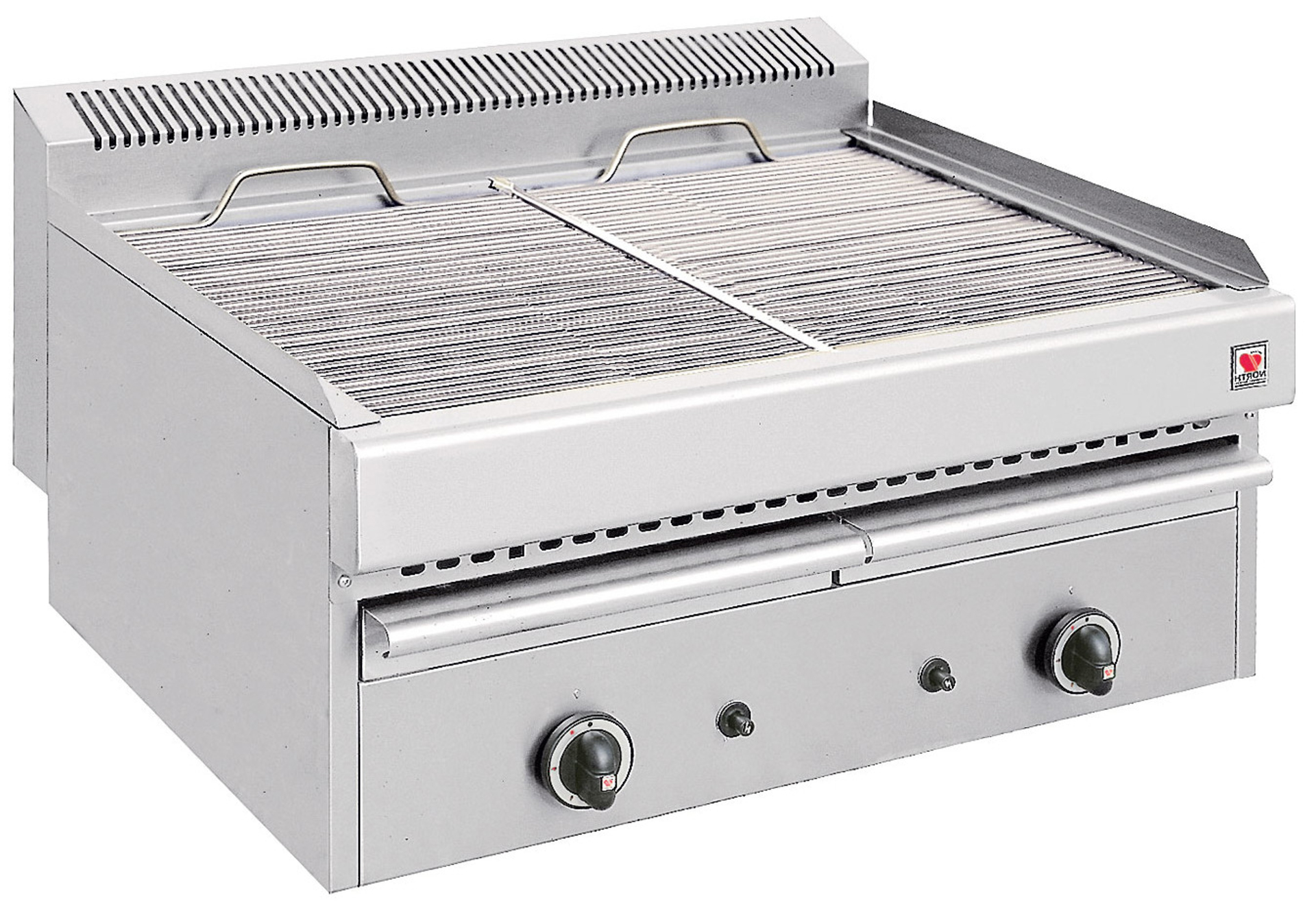 Επιτραπέζια σχαρίερα αερίου με συρτάρι νερού. Χάρη στους στιβαρούς και ισχυρούς σε ισχύ ανοξείδωτους καυστήρες η επιφάνεια ψήσεως είναι έτοιμη σε μικρό χρονικό διάστημα προς χρήση.