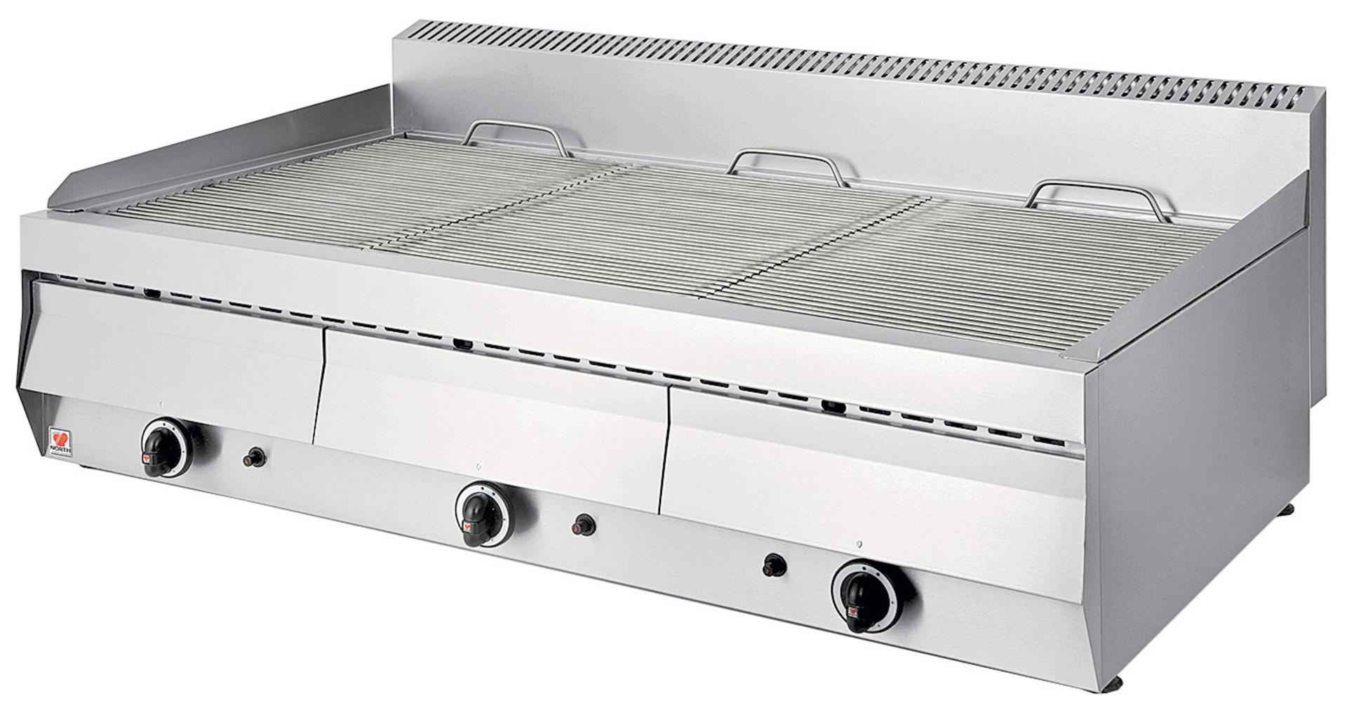 Επιτραπέζια σχαρίερα αερίου με συρτάρι νερού. Με ενιαία επιφάνεια χωρίς διαχωριστικά και με 3 ζώνες. Χάρη στους στιβαρούς και ισχυρούς σε ισχύ ανοξείδωτους καυστήρες η επιφάνεια ψήσεως είναι έτοιμη σε μικρό χρονικό διάστημα προς χρήση.