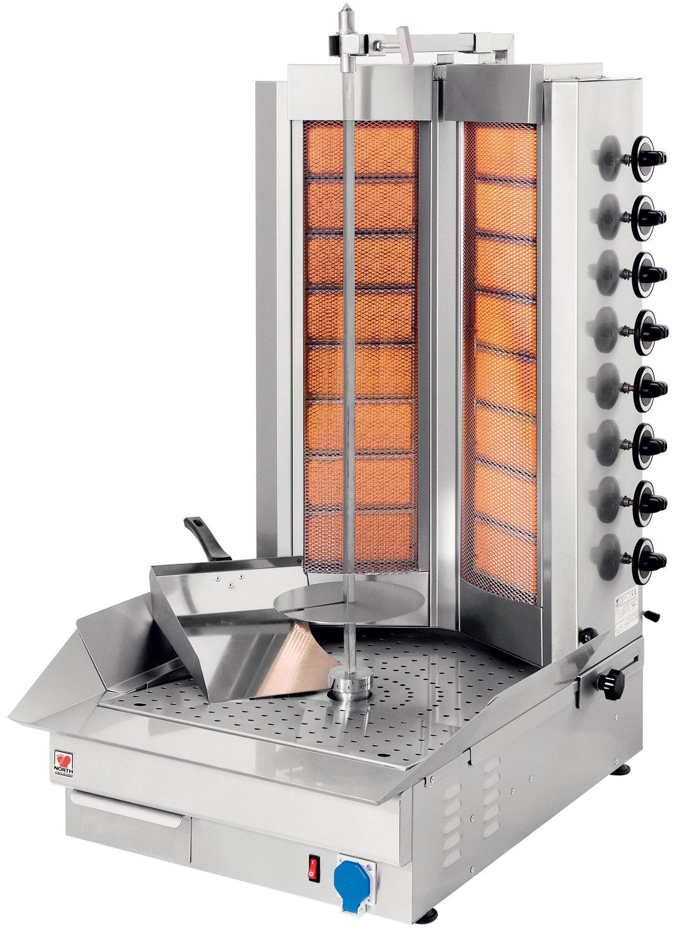 Μηχάνημα γύρου με turbo αποδόσεις. Με υψηλά προστατευμένο ΜΟΤΕΡ ΚΑΤΩ και καυστήρες και από τις δύο πλευρές του μηχανήματος ώστε να καταφέρνει να ψήσει πολύ πιο γρήγορα. Διαθέτει 8 διακόπτες και 16 καυστήρες, με δυνατότητα λειτουργίας ανά πλευρά για εξοικονόμηση ενέργειας-κατανάλωσης. Με περιφερειακούς συλλέκτες για την περισυλλογή του λίπους και του κρέατος, τα οποία αφαιρούνται εύκολα για τον καθαρισμό τους. Διάτρητο καπάκι κάτω από τη σούβλα σε συνδυασμό με, εργονομικό, διπλής χρήσης φτυαράκι. Σούβλα εξοπλισμένη με δισκάκι εύκολης εξαγωγής κατά την διάρκεια του ψησίματος.