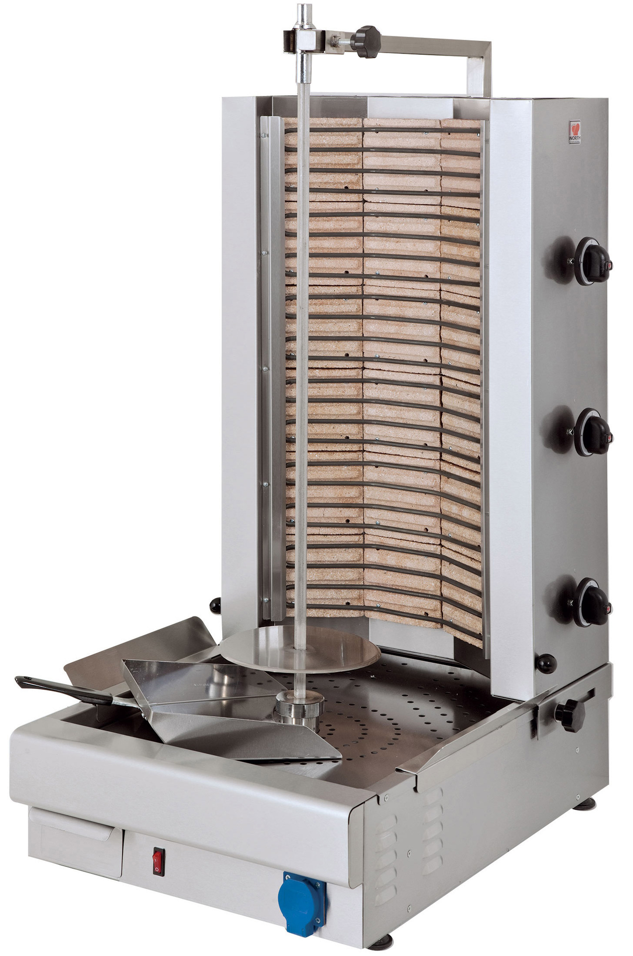Με μοτέρ στο κάτω μέρος της συσκευής και 3 διακόπτες. Εστία θερμότητας μετακινούμενη εμπρός-πίσω για το επιθυμητό αποτέλεσμα κατά την διάρκεια ψησίματος. Εξοπλισμένη με ειδικές πυρίμαχες πλάκες. Με συρτάρι λίπους για τον εύκολο καθαρισμό κατά την διάρκειά του ψησίματος. Διαθέτει ενσωματωμένη πρίζα για την σύνδεση ηλεκτρικού μαχαιριού.