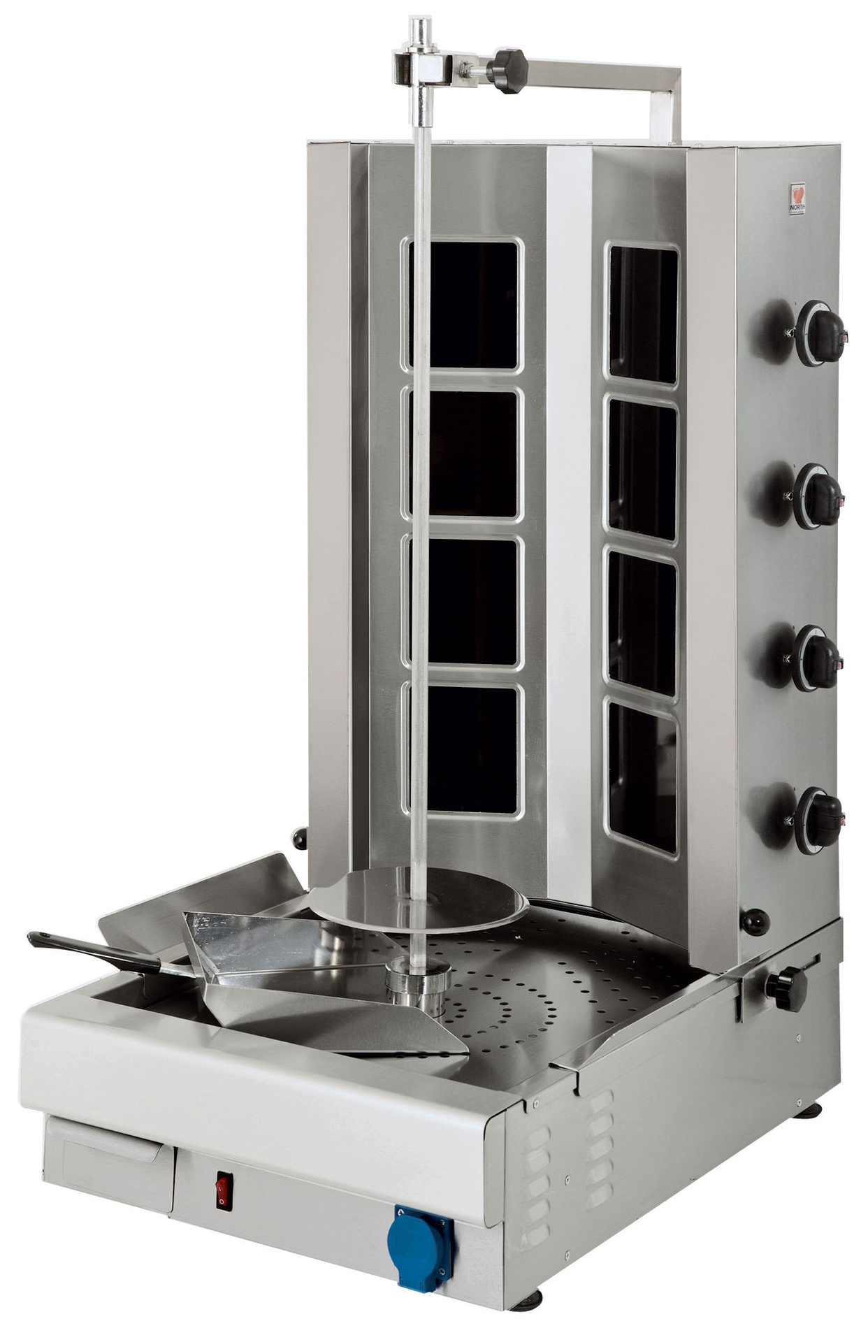 Με μοτέρ στο κάτω μέρος της συσκευής και 4 διακόπτες. Εστία θερμότητας μετακινούμενη εμπρός-πίσω για το επιθυμητό αποτέλεσμα κατά την διάρκεια ψησίματος. εξοπλισμένη με ειδικές κεραμικές αντιστάσεις, όπου προσφέρουν γρήγορο και οικονομικό ψήσιμο, 40% λιγότερη κατανάλωση από τις συμβατικές αντιστάσεις. Με συρτάρι λίπους για τον εύκολο καθαρισμό κατά την διάρκειά του ψησίματος. Διαθέτει ενσωματωμένη πρίζα για την σύνδεση ηλεκτρικού μαχαιριού.