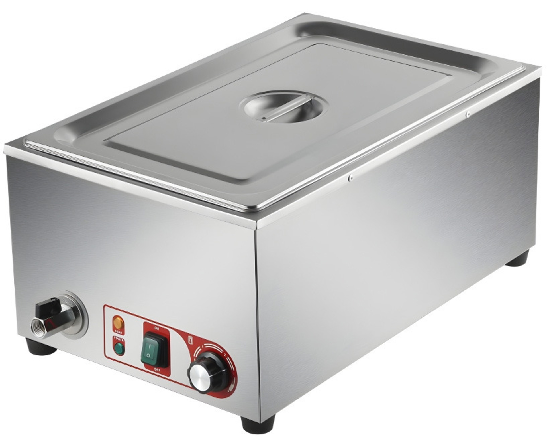 Κατασκευασμένο από ανθεκτικό ανοξείδωτο ατσάλι. Ζεσταίνει τις παρασκευές και τις διατηρεί φρέσκες. Με διακόπτη on-off και θερμοστάτη με εύρος θερμοκρασία 30-85°C. Υψος GN: 15cm. GN 1/1: 530x325mm. Με βρύση νερού.