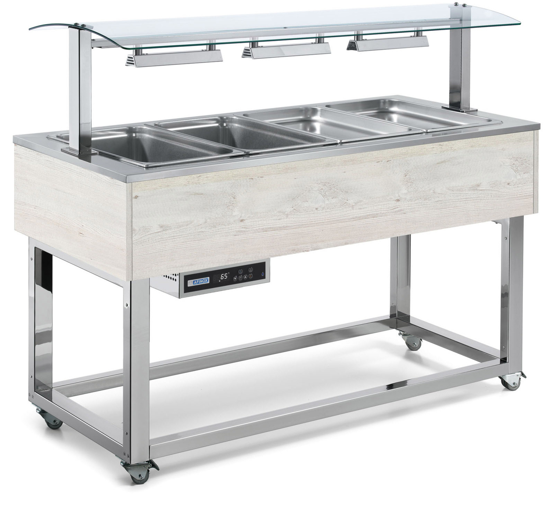 Μπουφές με θερμαινόμενο φρεάτιο μπεν μαρί, στιβαρό χρωμιωμένο ατσάλινο πλαίσιο σε ρόδες, βασικό ξύλινο φινίρισμα και γυάλινη υπερκατασκευή με θερμαινόμενους λαμπτήρες αλογόνου. Θέρμανση μέσω αντιστάσεων με θερμοστάτη ασφαλείας που αποτρέπει την υπερθέρμανση ή τη λειτουργία χωρίς νερό.
