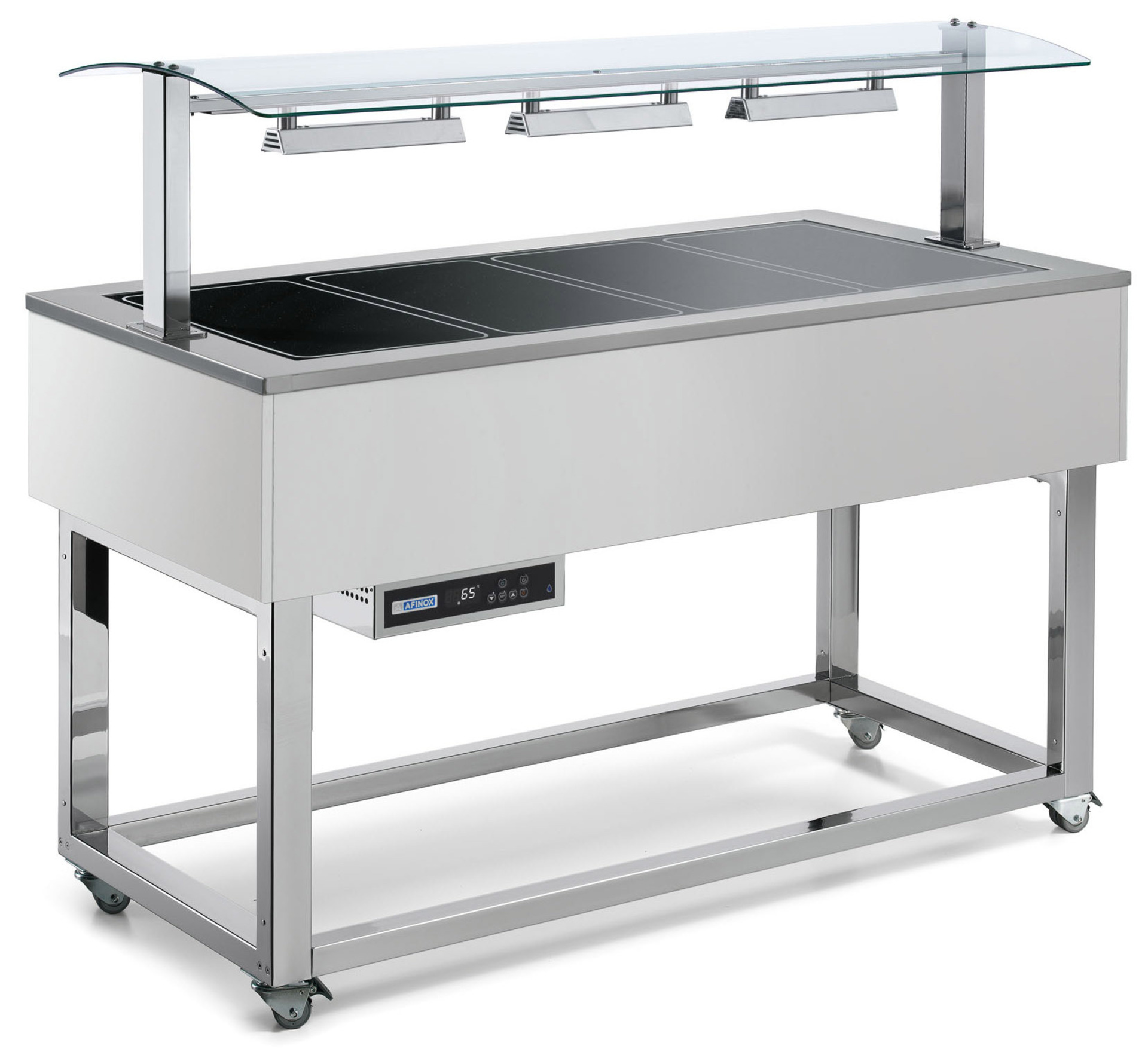 Μπουφές θερμαινόμενος με πλάκα από σκληρυμένο γυαλί, στιβαρό χρωμιωμένο ατσάλινο πλαίσιο σε τροχούς, βασικό ξύλινο φινίρισμα και γυάλινη υπερκατασκευή με θερμαντικές λάμπες αλογόνου.