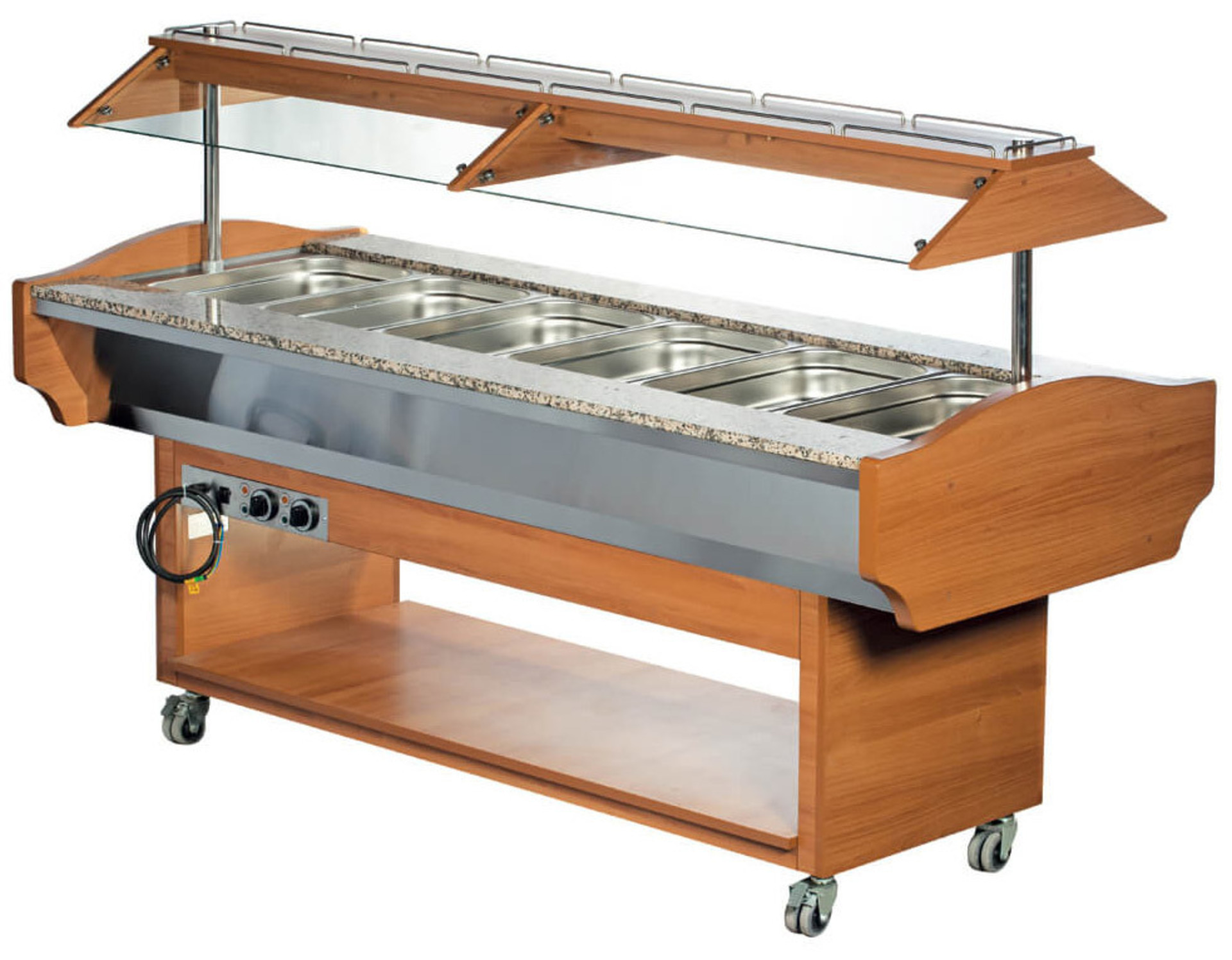 Βιτρίνα σαλατών θερμαινόμενη, τροχήλατη με φρένο στους δύο από τους τέσσερις τροχούς.