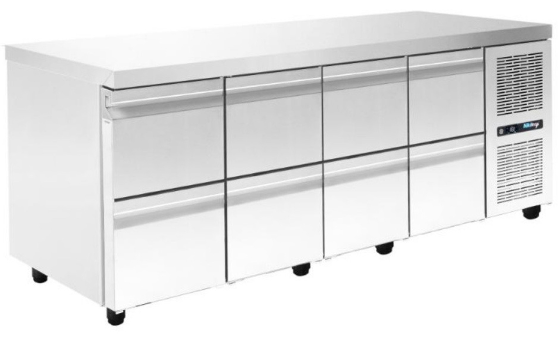 -Διάταξη: 4 διπλές συρταριέρες ½ -Κατασκευή από ανοξείδωτο χάλυβα AISI 304 -Σύστημα βεβιασμένης κυκλοφορίας αέρα για ομοιόμορφη κατανομή θερμοκρασίας -Εξωτερικό θερμόμετρο και θερμοστάτης -Αυτόματο σύστημα απόψυξης με ηλεκτρικές αντιστάσεις -Κουμπωτά μαγνητικά λάστιχα, εργονομικά χερούλια, τηλεσκοπικοί οδηγοί πλήρους ανάπτυξης -Βάθος:700 mm -Υποδοχή λεκάνης GN 1/1 -1 σχάρα ανά πόρτα Μόνωση πολυουρεθάνης υψηλής πυκνότητας -Αλλαγή πόρτας με οποιονδήποτε από τους τρεις τύπους συρταριού (κατόπιν παραγγελίας) -4 Εναλλακτικές για το καπάκι: απλό καπάκι, καπάκι με σήκωμα, καπάκι με γούρνα 30*32 ή χωρίς καπάκι (κατόπιν παραγγελίας) -Ρυθμιζόμενα ποδαρικά