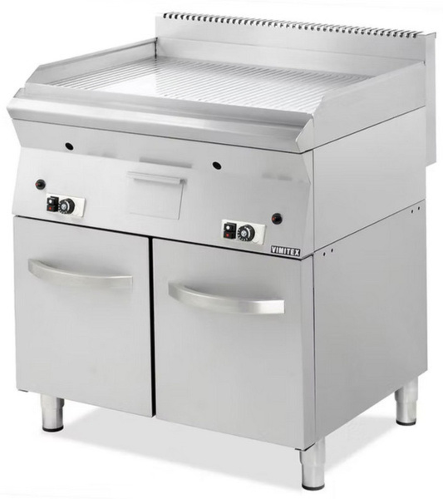 Διπλό - Επιδαπέδειο, σε κλειστό ερμάριο, με λεία πλάκα χρωμίου ΡΑΒΔΩΤΗ, εντυπωσιακά καθαρή επιφάνεια και απόλυτα αντικολλητική πλάκα-καθρέφτης. Με καυστήρα που διανέμει ομοιόμορφα τη θερμοκρασία στην επιφάνεια ψησίματος. Με περιστροφικό κουμπί προοδευτικής αυξομείωσης της φλόγας που πετυχαίνει απόλυτο έλεγχο της θερμοκρασίας επάνω στην σχάρα. Ανάφλεξη και επίβλεψη της φλόγας με πιεζοηλεκτρικό αναπτήρα και πιλότο, τοποθετημένα σε απόλυτα προστατευμένο σημείο από λίπη και λάδια στο μπροστινό μέρος της συσκευής για εύκολη πρόσβαση. Θερμοστατικός έλεγχος πλάκας 100-270 ºC