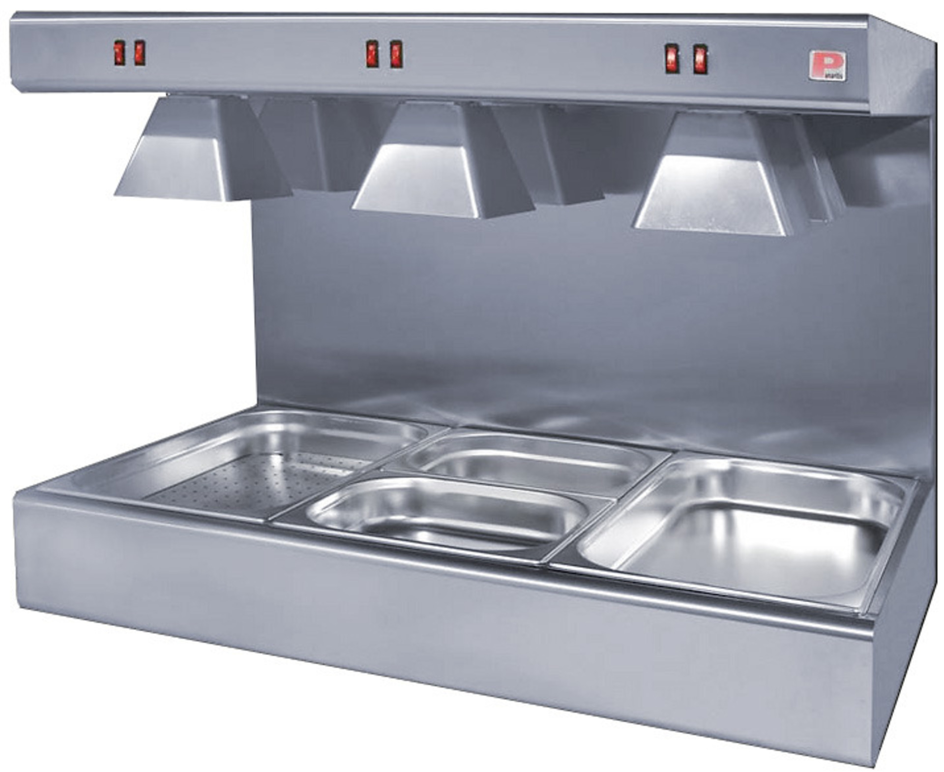 Θερμαντικός σταθμός με 6 λάμπες των 175W ο καθένας, για διατήρηση της θερμοκρασίας του κρέατος και των τηγανητών πατατών.