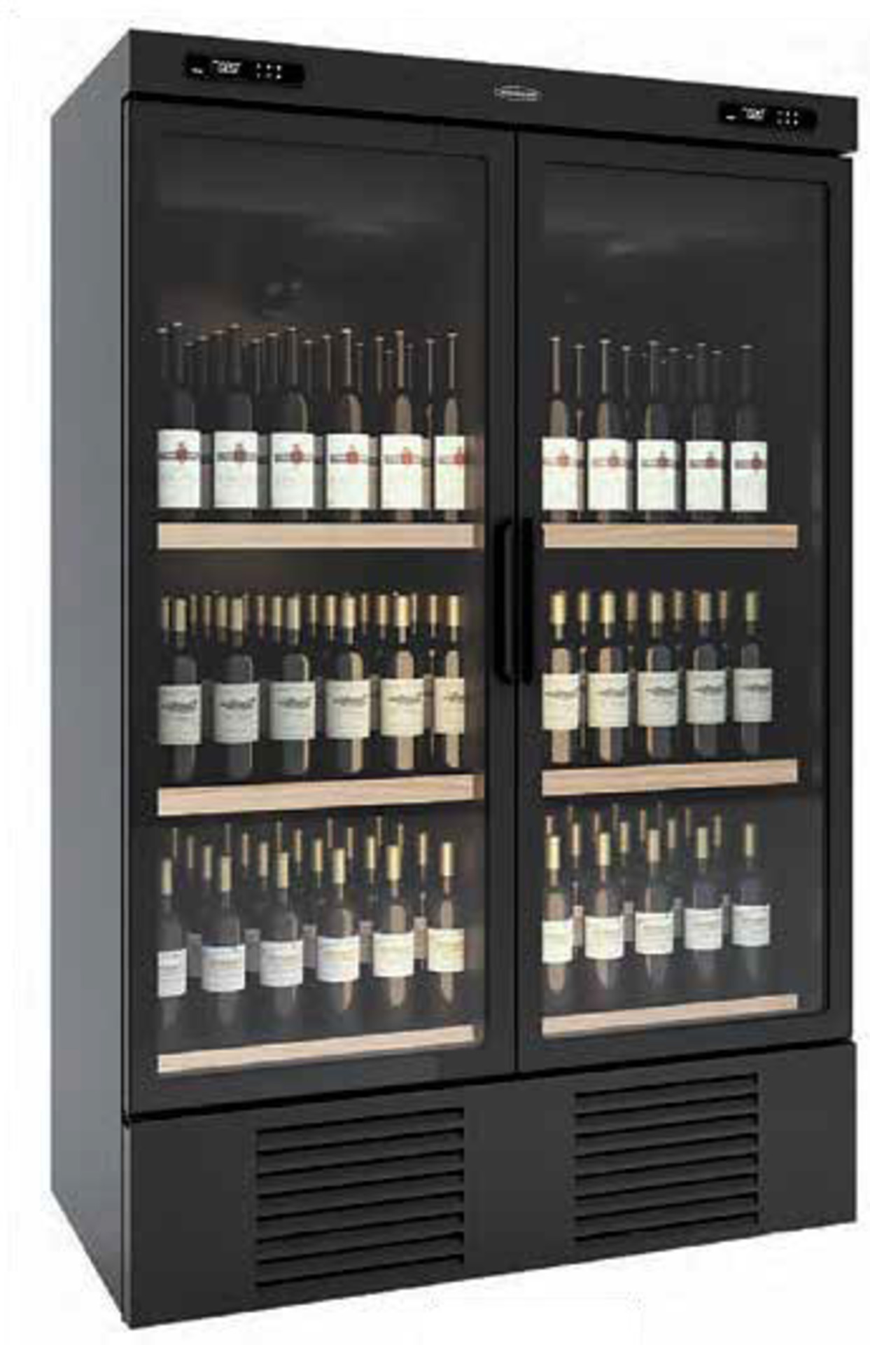 Με 2 ξεχωριστούς θαλάμους, βεβιασμένης ψύξης, διαφορετικών θερμοκρασιών ο καθένας: +4°C/+10°C για τα λευκά και τα ροζε και +10°C/+18°C για τα κόκκινα. Αποθηκεύει κάθετα (όρθια) τα μπουκάλια. Ανοιγόμενες μαύρες πόρτες που κλείνουν αυτόματα (μένουν ανοιχτές όταν είναι περισσότερο από 90°). -Φωτισμός LED. -Με πέντε ράφια σε κάθε θαλάμη. -Ηλεκτρονική ρύθμιση της θερμοκρασίας. -Μαύρο χρώμα