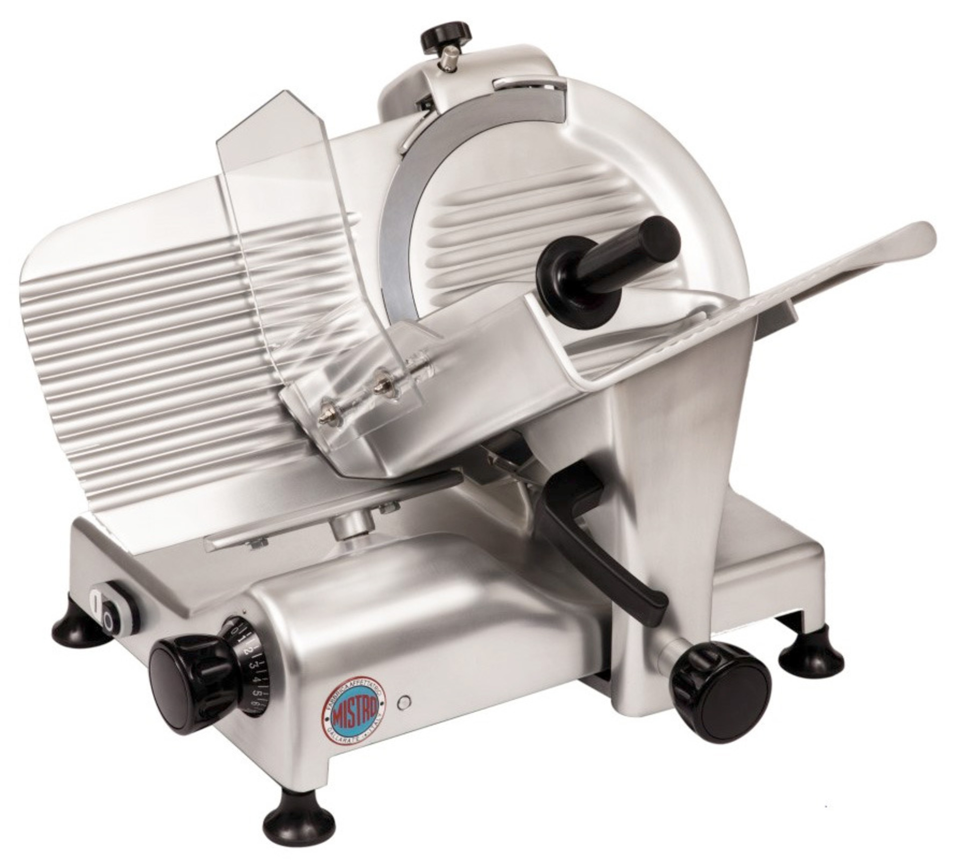 Στιβαρή και σταθερή κατασκευή σε όλα τα εξαρτήματα από ανοδιωμένο αλουμίνιο. Διάμετρος λεπίδας 30cm, άφθονος χώρος μεταξύ της λεπίδας και της βάσης για διευκόλυνση του καθαρισμού. Λεπίδα από ανοξείδωτο χάλυβα, ανοξείδωτο ατσάλι και χρώμιο «Made in Italy», κλίση λεπίδας 35°. Κινούμενα μέρη που γλιστρούν σε δακτυλίους Teflon που επιτρέπουν μια ομαλή και εργονομική κίνηση χωρίς φθορά του χειριστή. Ενσωματωμένη ξύστρα με λείανση που εγγυάται την τέλεια όξυνση της λεπίδας και καθαρή κοπή του προϊόντος. Αθόρυβος κινητήρας, μονοφασικός ή τριφασικός. Ψύξη κινητήρα με εξαερισμό. Κίνηση με ιμάντα. Ενσωματωμένο ακονιστήρι με ειδικό προφυλακτήρα που “κρύβει” τη λεπίδα του μαχαιριού.Μπουτόν on / off με ρελέ ασφαλείας.